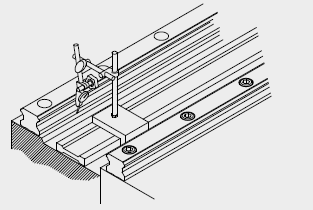 將直線塊規(guī)置于兩支導(dǎo)軌間,使用千分量表校準(zhǔn)直線塊規(guī),使之與基準(zhǔn)側(cè)導(dǎo)軌之側(cè)邊基準(zhǔn)面平行,再依直線塊規(guī)校準(zhǔn)從動側(cè)導(dǎo)軌,從導(dǎo)軌的一端開始校準(zhǔn)并依序以特定的扭力鎖緊裝配螺絲。