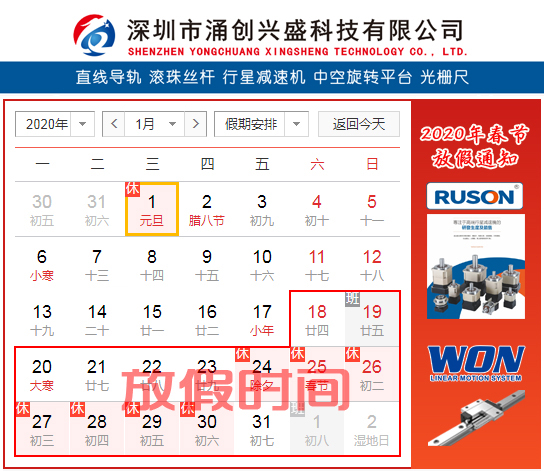 在2020年春節(jié)即將到來之際,涌創(chuàng)公司非常感謝您們一直以來的支持和關注,非常感謝您們對我公司代理產品WON直線導軌及RUSON行星減速機的認可,在以后的日子里,公司將會不斷的完善產品的質量及相關的服務,爭取為各位新老客戶謀取最大的利益及最好的技術服務支持!