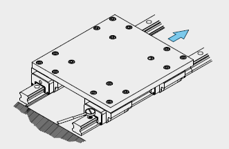 將直線塊規(guī)置于兩支導(dǎo)軌間,使用千分量表校準(zhǔn)直線塊規(guī),使之與基準(zhǔn)側(cè)導(dǎo)軌之側(cè)邊基準(zhǔn)面平行,再依直線塊規(guī)校準(zhǔn)從動側(cè)導(dǎo)軌,從導(dǎo)軌的一端開始校準(zhǔn)并依序以特定的扭力鎖緊裝配螺絲。