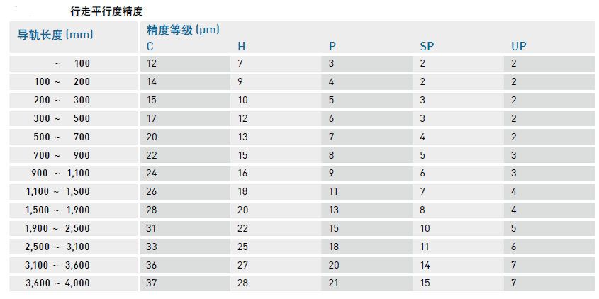 HDS2滾輪導(dǎo)軌分為兩種精度等級(jí):普通級(jí)C(commercial)和精密級(jí)P(precision), 精度指標(biāo)如下: